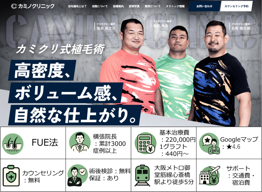 カミノクリニックは東京銀座に拠点を持つ自毛植毛クリニックで、実績の多さとリーズナブルな料金設定が魅力です。